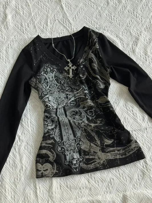 HOUZHOU Vintage Gothic T-shirts Women Y2k Black Punk Graphic T-shirt Grunge Retro Sexy V-neck Cotton Tees Aesthetic Harajuku Top