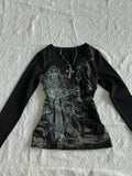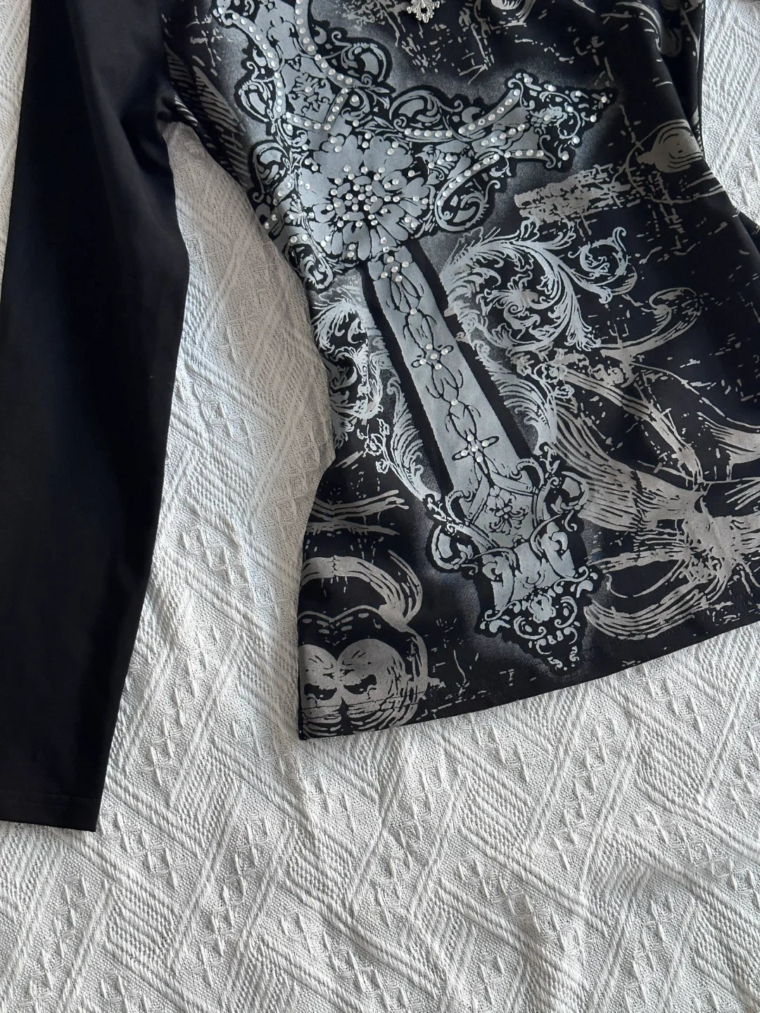 HOUZHOU Vintage Gothic T-shirts Women Y2k Black Punk Graphic T-shirt Grunge Retro Sexy V-neck Cotton Tees Aesthetic Harajuku Top